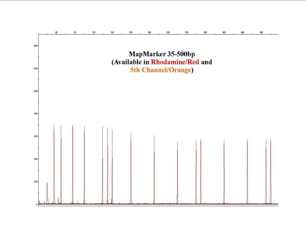 MapMarker® 35-500bp contains 16 discrete DNA fragments specifically designed to utilize the default parameters on GeneMapper™ and GeneScan™ DNA Fragment Analysis Software and labeled with DY632 (Orange/Fifth Channel). They are uniformly spaced at 35, 50, 75, 100, 130, 150, 160, 200, 250, 300, 340, 350, 400, 450, 490, and 500 base pairs. Unit Size: 400ul (800 Loadings)