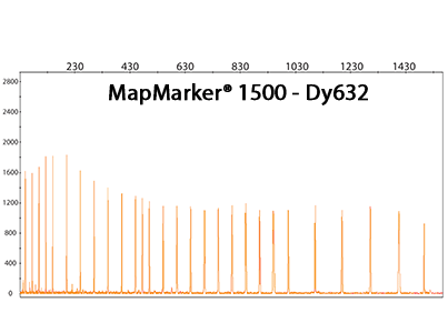 MapMarker® 1500 contains 28 discrete DNA fragments ranging in size from 50 to 1000 base pairs labeled with Dy632 (5th dye, orange channel). The fragments are 50, 75, 100, 125, 150, 200, 250, 300, 350, 400, 450, 475, 500, 550, 600, 650, 700, 750, 800, 850, 900, 950, 1000, 1100, 1200, 1300, 1400, and 1500 base pairs. Unit Size: 400ul (800 Loadings)