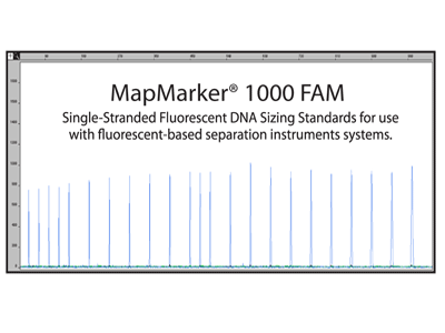 MapMarker® DNA sizing standards are sets of high quality fluorescently labeled DNA fragments designed to provide accurate base calling and precision sizing of samples with consistent intensities and migration patterns. They are compatible with the most commonly used fluorescent-based separation instruments systems, including capillary-based gel electrophoresis genetic analysis systems.