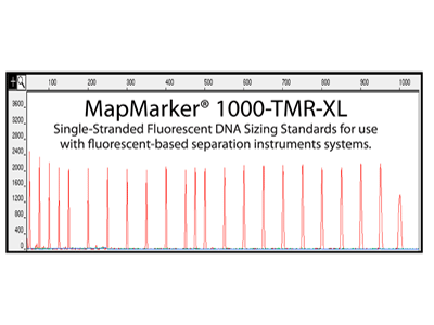 MapMarker® DNA sizing standards are sets of high quality fluorescently labeled DNA fragments designed to provide accurate base calling and precision sizing of samples with consistent intensities and migration patterns. They are compatible with the most commonly used fluorescent-based separation instruments systems, including capillary-based gel electrophoresis genetic analysis systems.