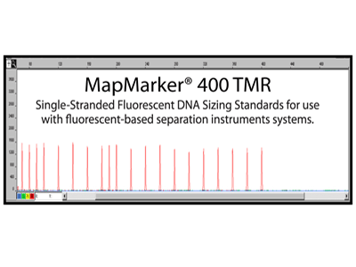MapMarker® 400 contains 20 discrete DNA fragments ranging in size from 70 to 400 base pairs labeled with Tetramethylrhodamine at 8fmol/Band/ul. They are uniformly spaced at 70, 80, 90, 100, 120, 140, 160, 180, 190, 200, 220, 240, 260, 280, 300, 320, 340, 360, 380, and 400 base pairs. Unit Size: 400ul (800 Loadings)